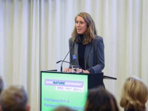 Svenja Golombek, Leiterin für Sport und Tourismus beim ZIV, diskutierte mit Vertreterinnen und Vertreter aus Politik, Verbänden, Schulen und Regionen beim Fachgespräch „Breitensport Mountainbiken“ in Berlin.