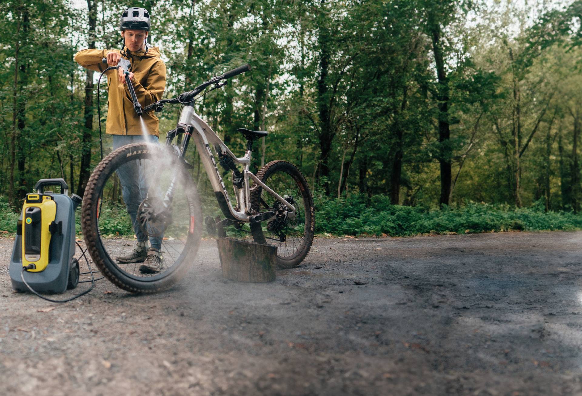 Der akkubetriebene Mitteldruckreiniger „OC 6-18 Premium“ von Kärcher leistet einen Wasserdruck von bis zu 24 bar und reinigt damit schonend, aber effizient alle Teile am Fahrrad. Dank Akku-Technologie und durch den zwölf Liter fassenden Wasser-Trolley wird der Einsatz unabhängig von Wasser- und Stromanschluss ermöglicht. Das Wasser reicht für circa drei bis fünf verschmutzte Fahrräder. Schlauch, Pistole und Strahlrohr lassen sich einfach, platzsparend und sicher am Gerät verstauen.