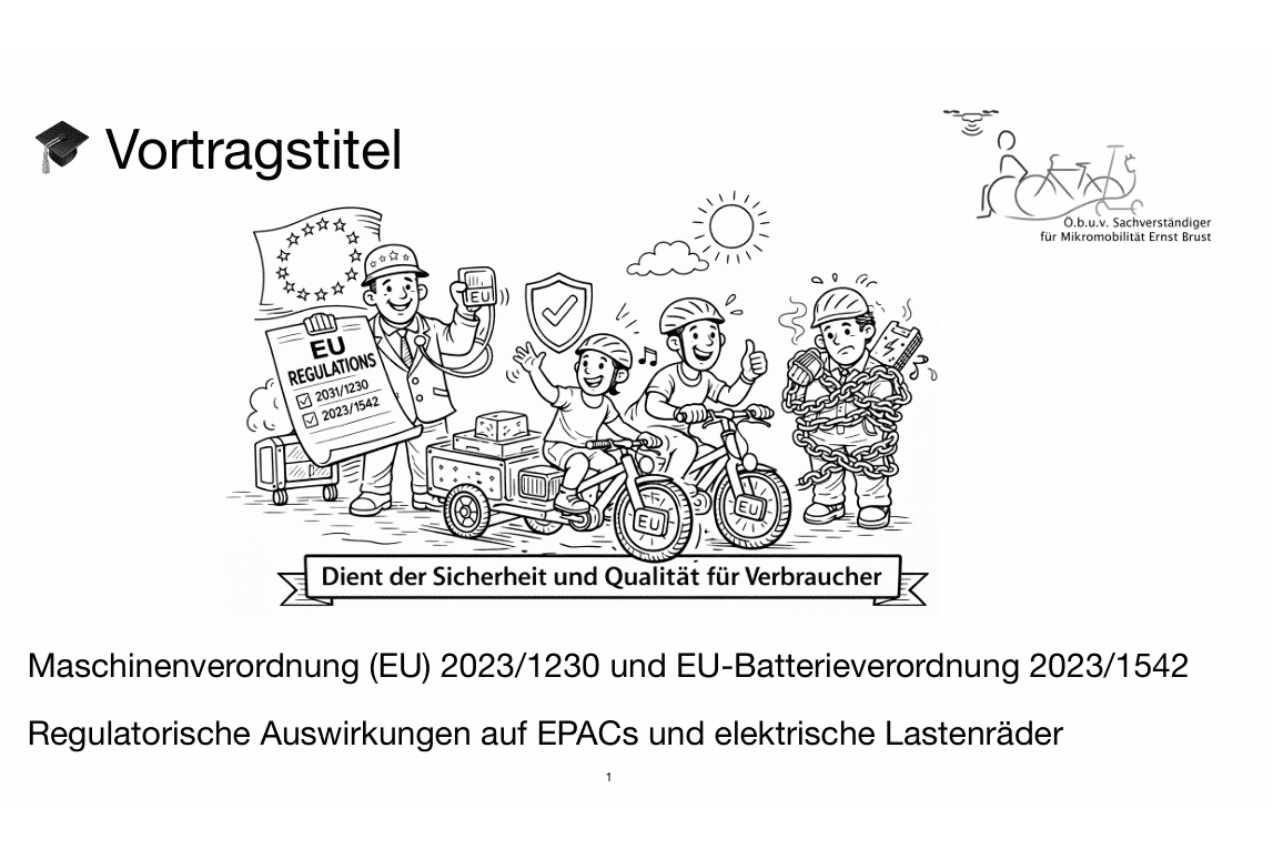 Im Fokus sollen die regulatorischen Auswirkungen auf EPACs (Pedelecs) und elektrische Lastenräder stehen, insbesondere im Hinblick auf Konstruktion, Risikobeurteilung, Software-Update und Produkthaftung sowie Batteriemanagementsysteme.