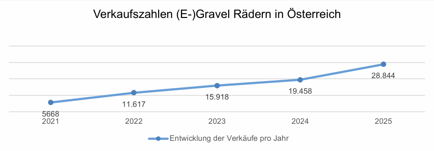Den stärksten Zuwachs verzeichnet 2025 die Gravel-Kategorie. Insgesamt wurden in Österreich 28.844 (E-)Gravelbikes verkauft, ein Plus von 48,3 Prozent gegenüber 2024. Bei den nicht elektrischen Modellen (Gravel und Cyclocross) weisen die Zahlen einen Anstieg um 74 Prozent auf rund 24.000 Stück aus.