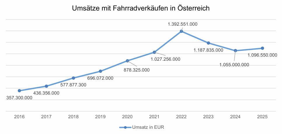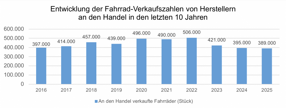 Die Fahrradindustrie hat 2025 rund 389.000 Fahrräder an den österreichischen Sport- und Fahrradfachhandel verkauft. Das entspricht einem Minus von 1,7 Prozent gegenüber 2024. Es handelt sich dabei ausdrücklich um Sell-in-Zahlen (Hersteller an Handel), nicht um Endkundinnen- und Endkunden-Verkäufe.